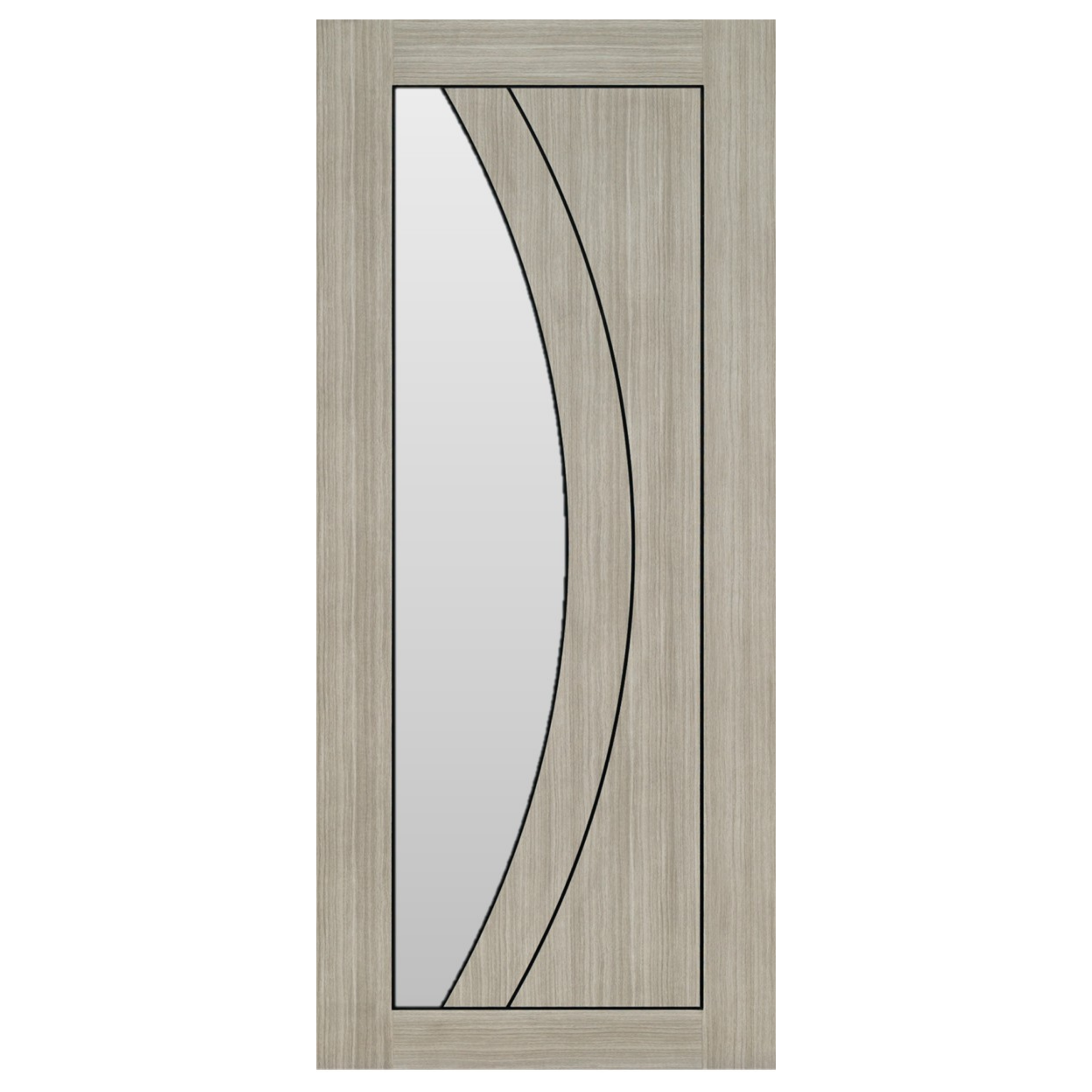 The Laminate Light Grey Sorrento Glazed Internal Door with Black Grooves is a contemporary statement door that combines a soft grey wood grain finish with striking curved black detailing and a distinctive glazed panel. Designed to stand out, this modern internal door brings both style and functionality to any interior space.